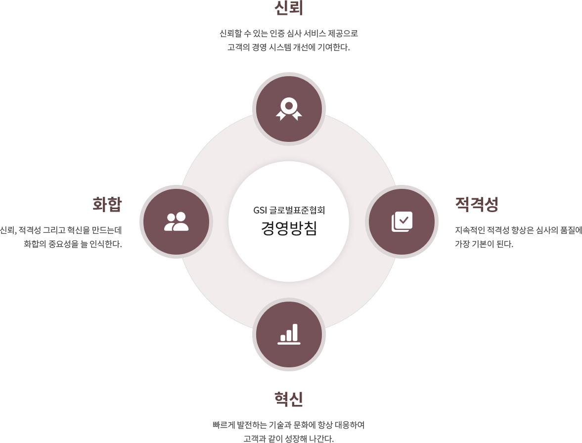 GSI는 모든 산업분야 및 시장에서 고객들이 기대하는 바를 완전하게 충족하는 최상의 인증심사 서비스를 제공해야 한다.